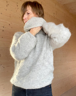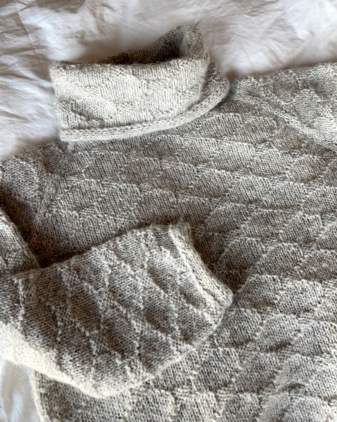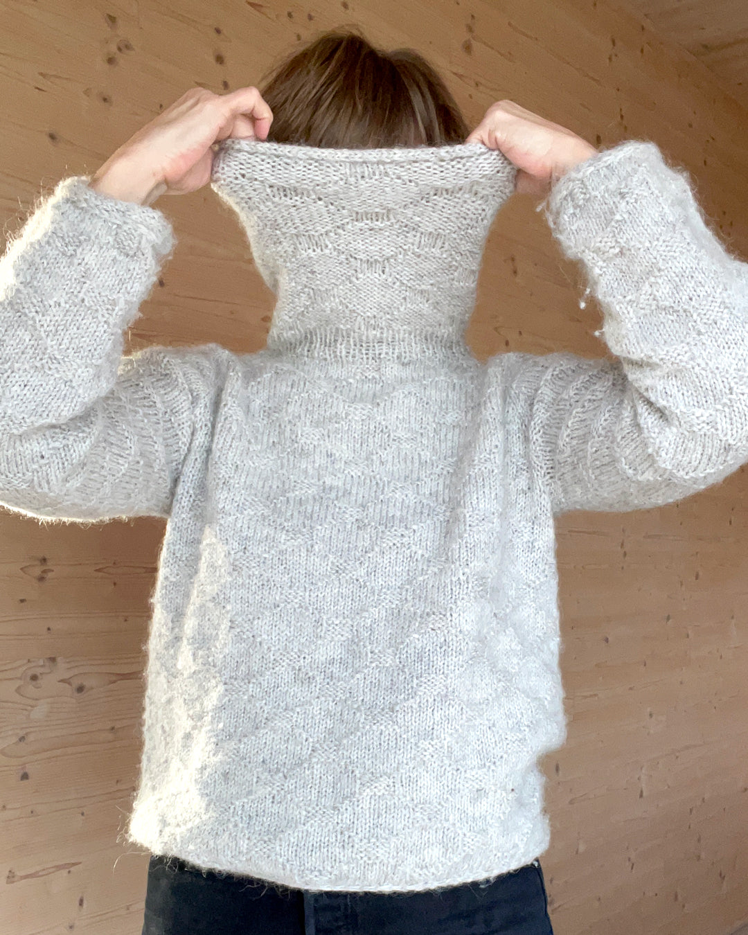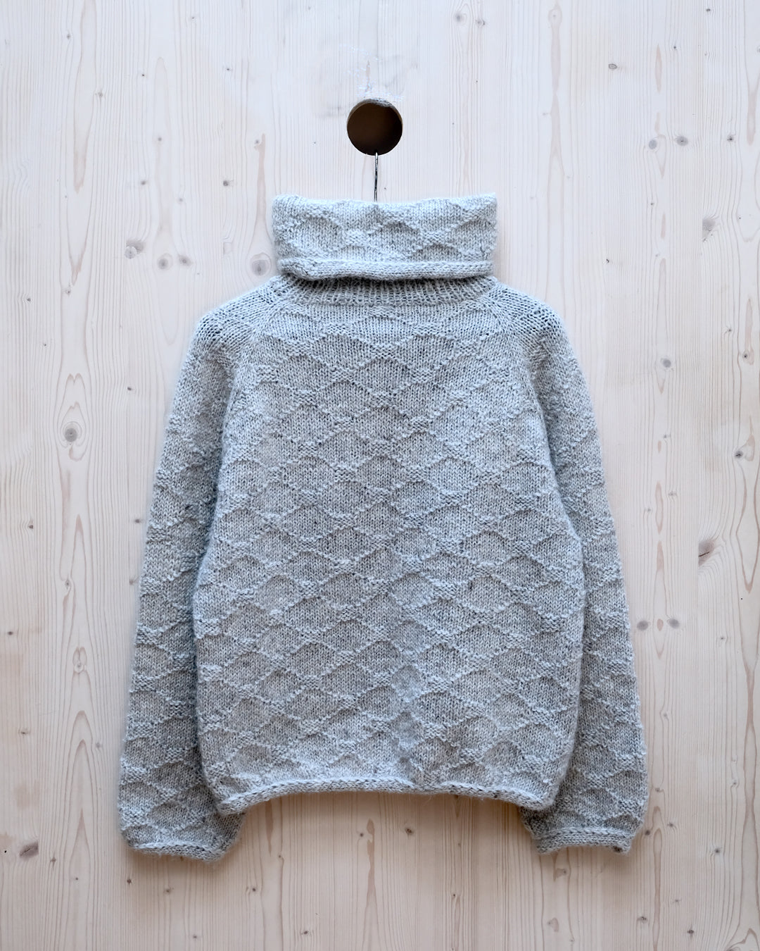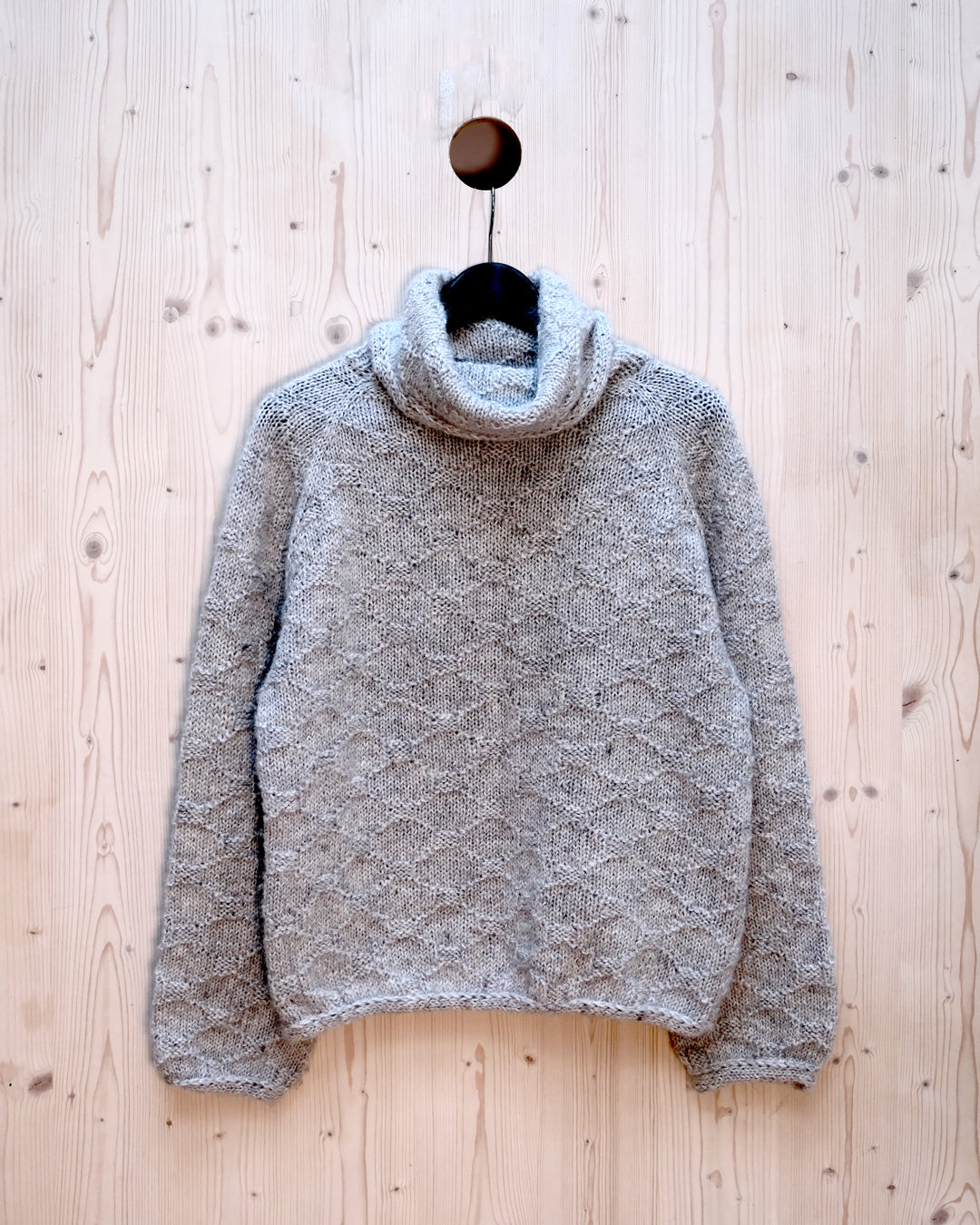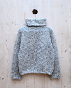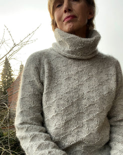 This version is knitted in our L yarn, creating a warm and comfortable sweater. The pattern stands out beautifully in the wool yarn, and the characteristic patterned turtleneck makes it extra cosy – but if you prefer, the sweater can also be knitted without the turtleneck. Chunky Vala is the thicker version of the Vala sweater, which was initially designed for pure silk yarn.