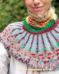 Each skein of Sari Silk is one of a kind, full of hidden nuances that reveal themselves as the knitting takes shape. The meeting of the blue wool and the playful, unpredictable silk gives this sweater a unique expression. Working with Sari Silk is always a joyful surprise; you’ll find yourself knitting “just one more row” to see how the colours unfold next.