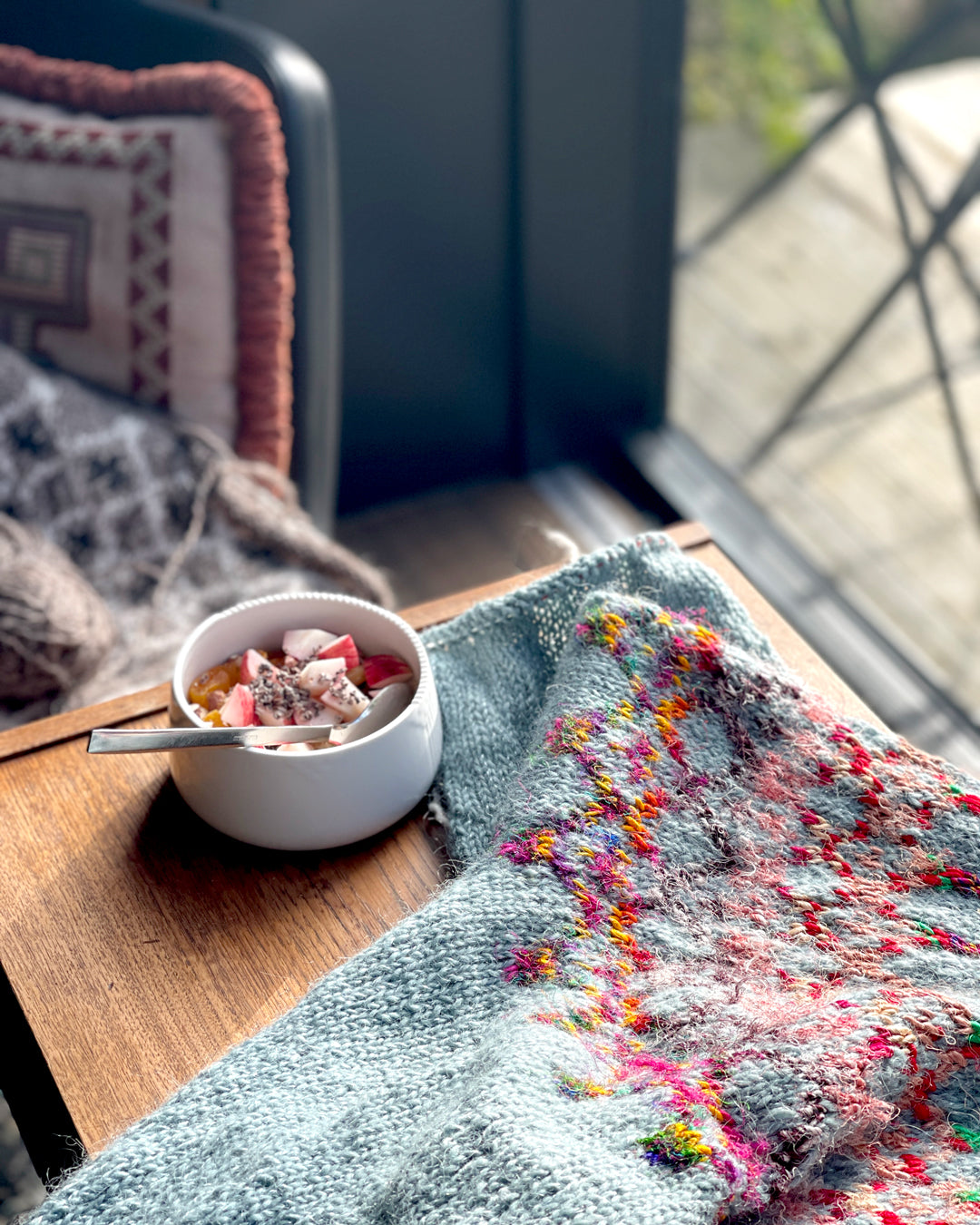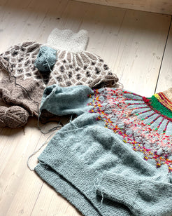 This version of the Mega Afi sweater is worked with L-yarn in a beautiful blue shade as the main color. The calm depth of the blue creates a striking backdrop that highlights the vibrant, shifting colors of the pattern, which is worked in Wher’s my Sari, a 100% recycled silk yarn.